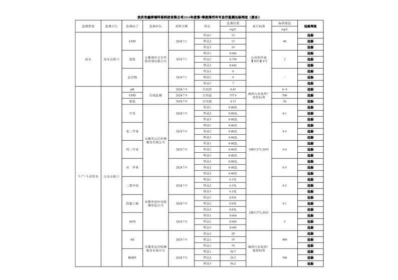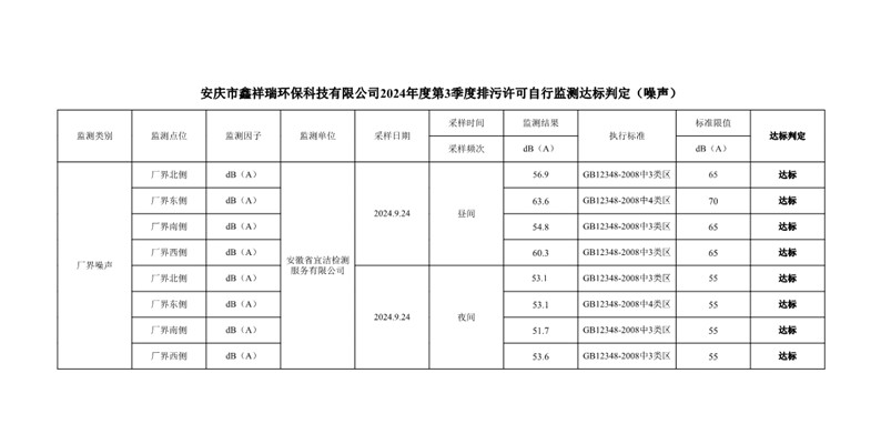 安庆市鑫祥瑞环保科技有限公司2024年第3季度排污许可自行监测公开